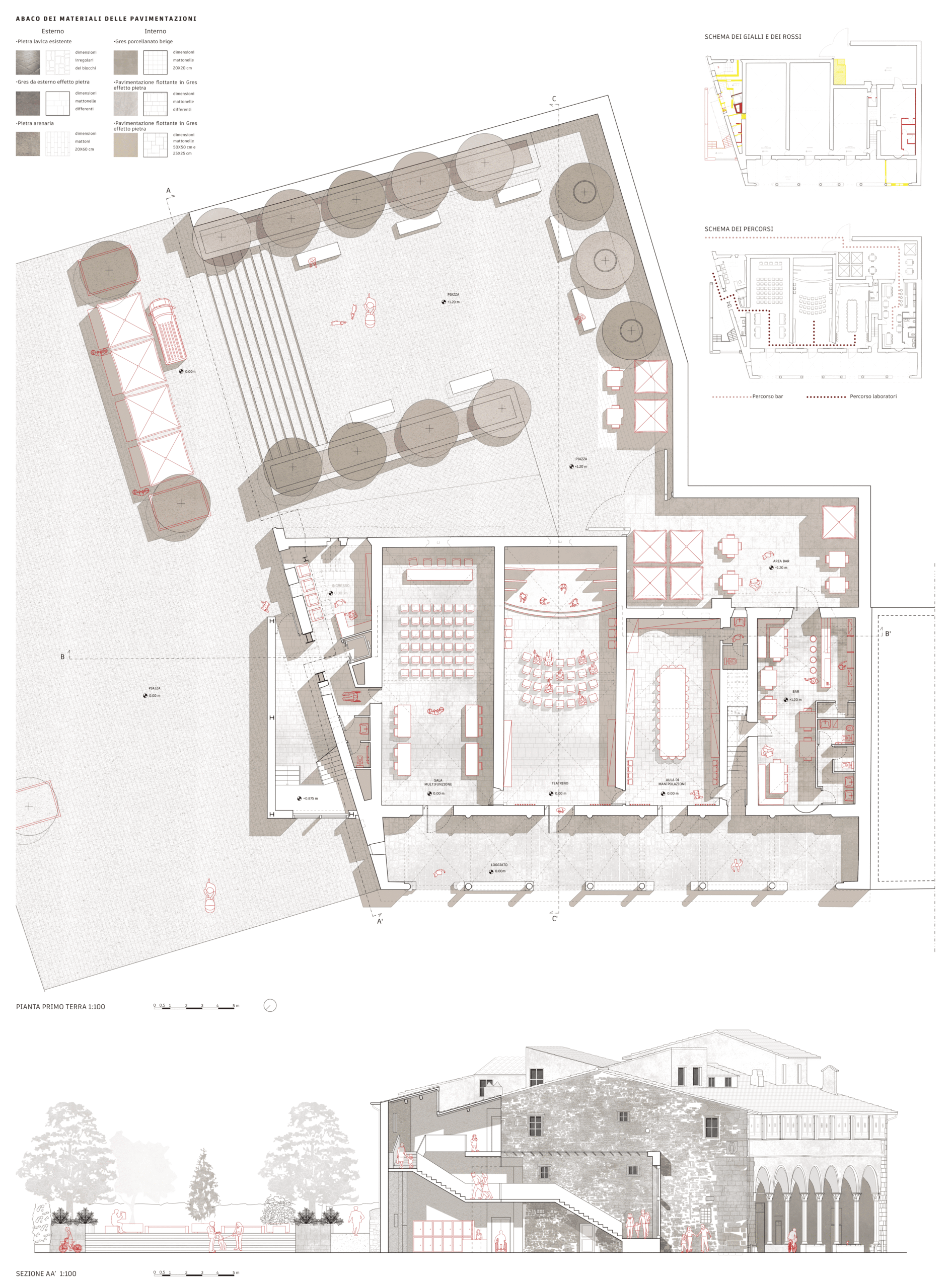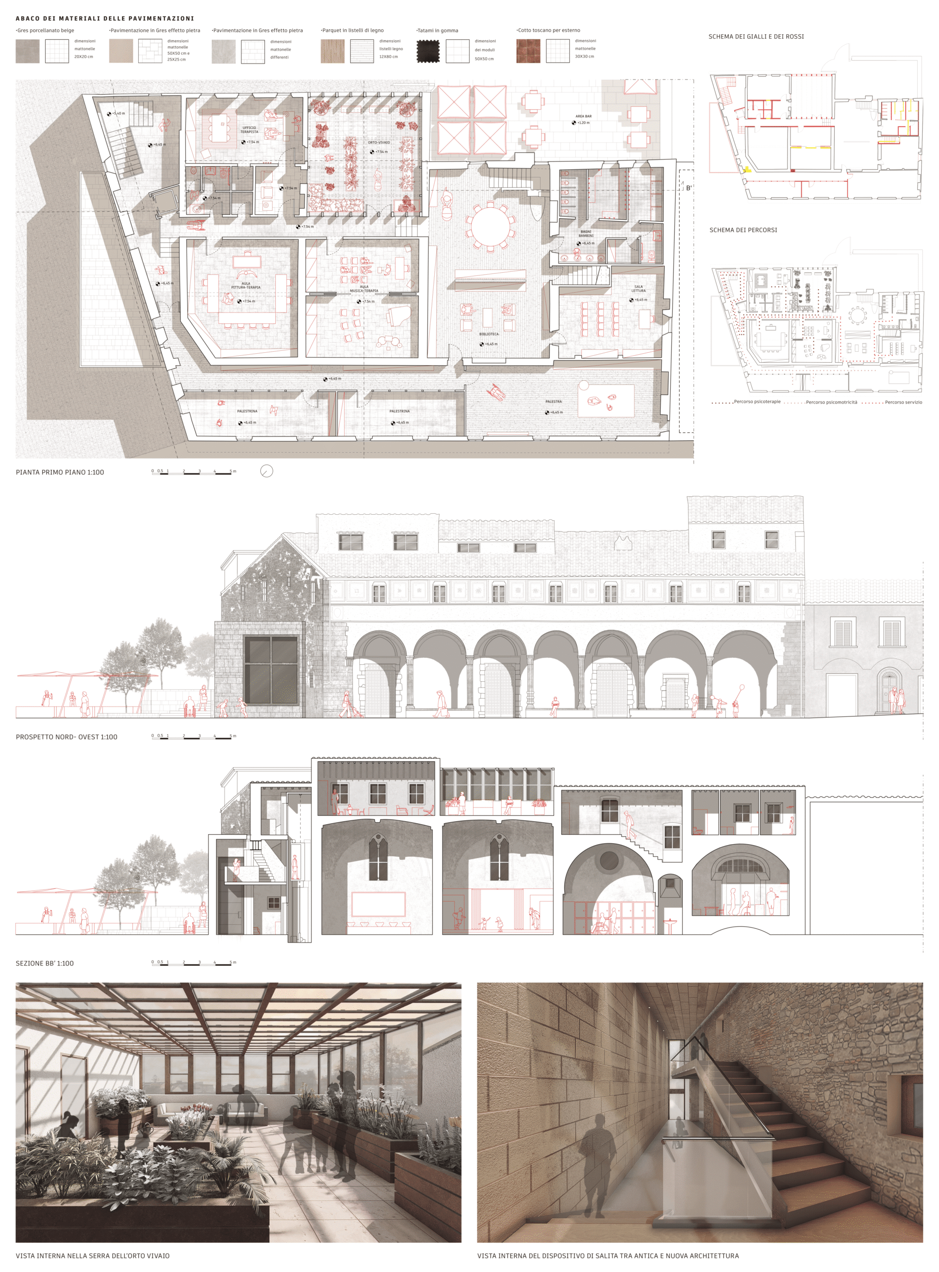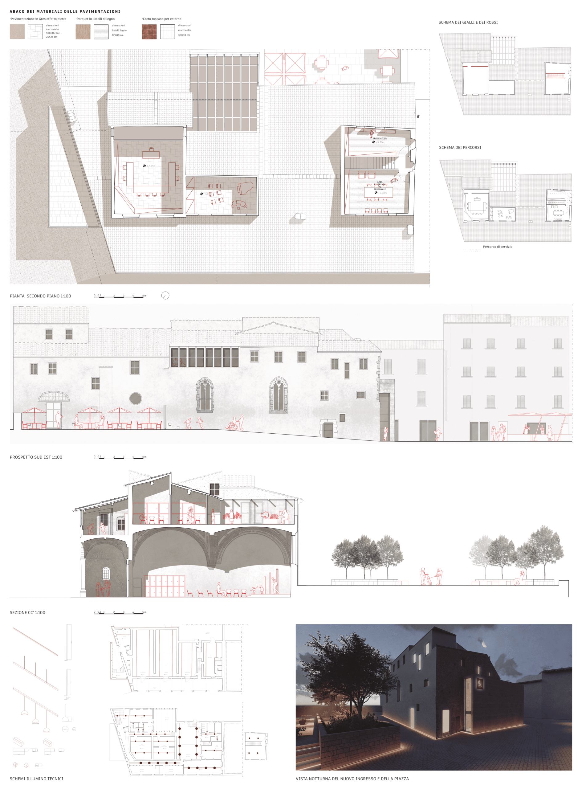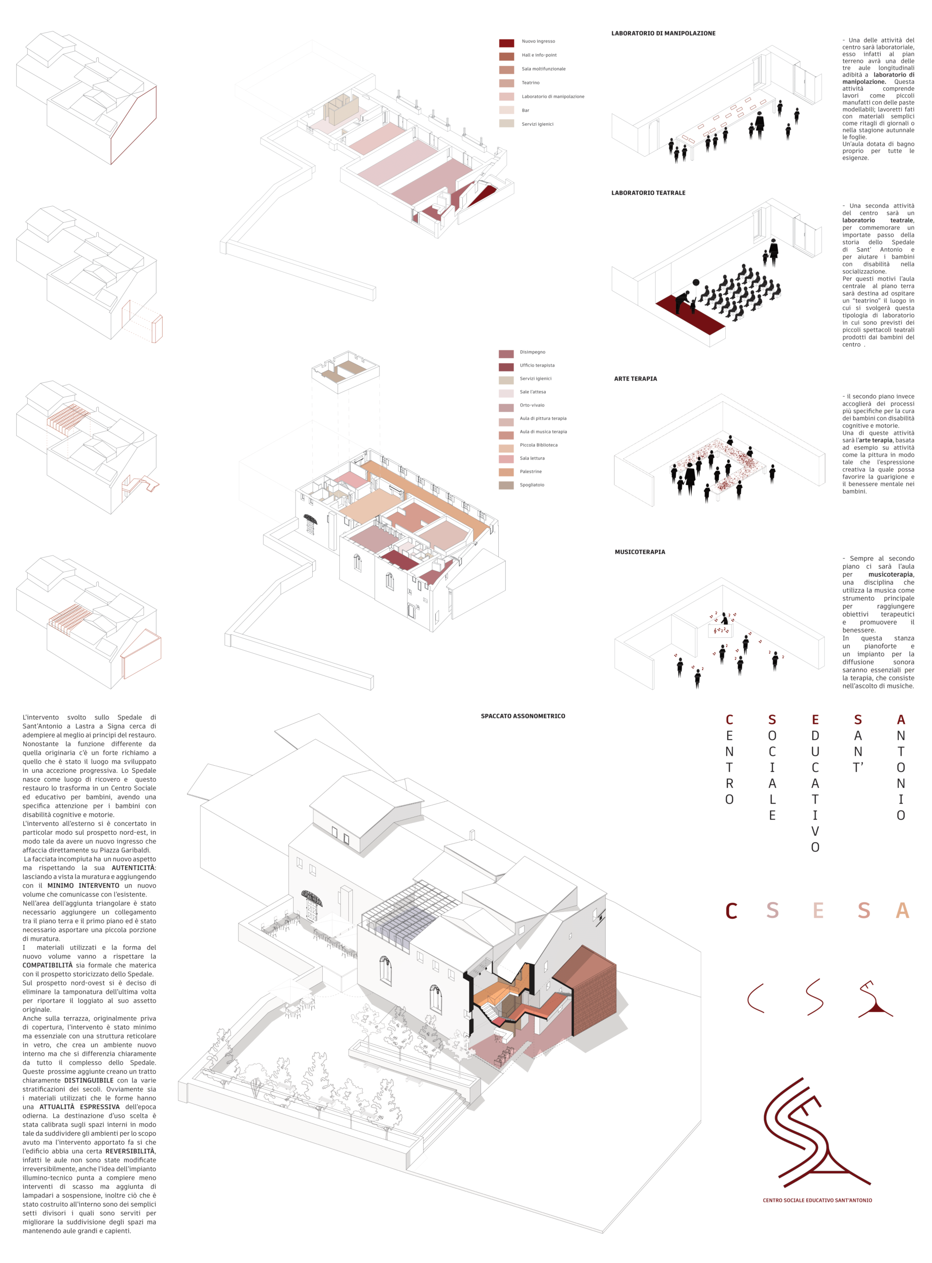 L’intervento sullo Spedale Sant’Antonio rispetta i principi del restauro e il legame con la sua identità storica, reinterpretando la funzione originaria di accoglienza. Da luogo di ricovero, diventa Centro Sociale ed Educativo per bambini, con attenzione all’inclusione delle disabilità. All’esterno, l’intervento si concentra sul prospetto nord-est, dove viene realizzato un nuovo ingresso su Piazza Garibaldi. La facciata incompiuta ha un nuovo aspetto ma rispettando AUTENTICITÀ: lasciando a vista la muratura e aggiungendo con il MINIMO INTERVENTO un nuovo volume che comunicasse con l’esistente. Nell’area dell’aggiunta triangolare è stato necessario aggiungere un collegamento tra il piano terra e il piano primo. I materiali utilizzati e la forma del nuovo volume vanno a rispettare la COMPATIBILITÀ sia formale che materica con il prospetto storicizzato dello Spedale. Sulla terrazza, originalmente priva di copertura è stata aggiunta una struttura reticolare in vetro per attività green per bambini. I prossimi interventi creano un tratto DISTINGUIBILE con la varie stratificazioni dei secoli. Ovviamente sia i materiali utilizzati che le forme hanno una ATTUALITÀ ESPRESSIVA dell’epoca odierna. L’intervento apportato fa si che l’edificio abbia una certa REVERSIRILITÀ, infatti le aule non sono state modificate irreversibilmente, anche l’idea dell’impianto illumino-tecnico punta a compiere meno interventi di scasso con l’aggiunta di lampadari a sospensione. (Collab.: arch. Simone Alinari, arch. Giovanni Amaducci, arch. Antonietta Lombardi)